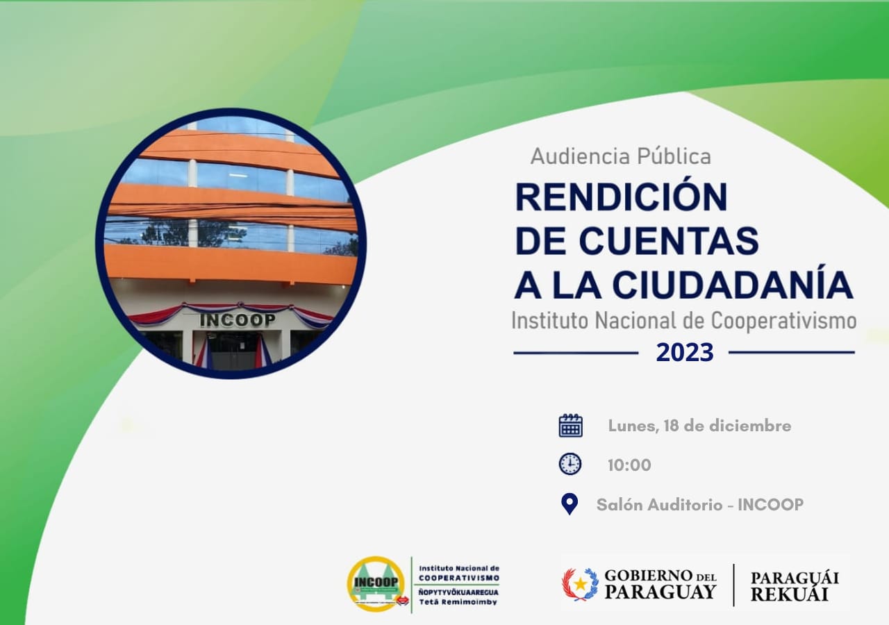El día lunes 18 de diciembre del corriente año a las 10:00 hs, el Instituto Nacional de Cooperativismo llevará a cabo su Rendición de Cuentas a la Ciudadanía-Ejercicio 2023, en el Salón Auditorio institucional.