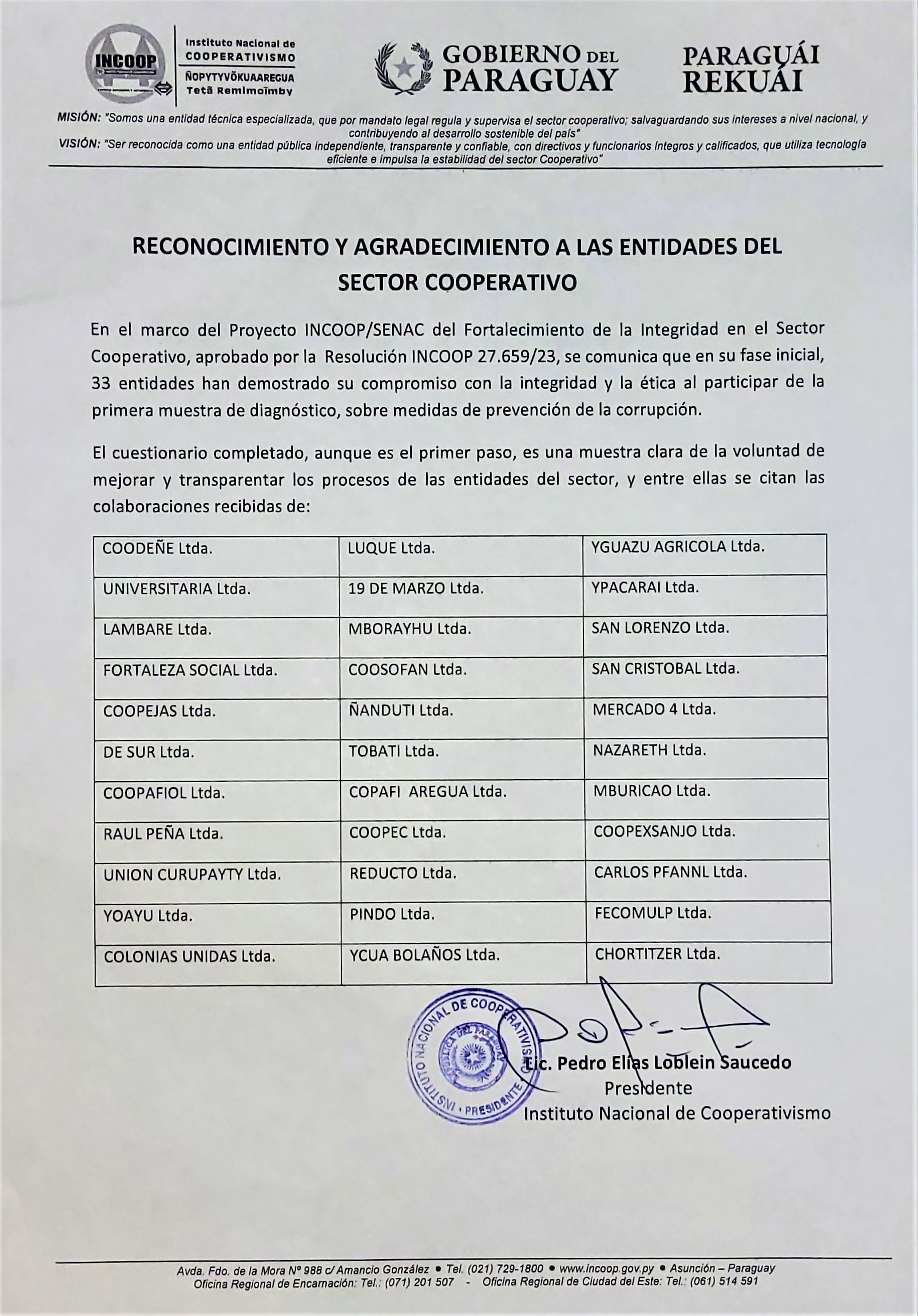 El encuentro contó con la presencia del Presidente del INCOOP, Abog. Nilton Maidana Vega. Como disertantes estuvieron, la Lic. Ma. Mercedes Ortega (Directora de Proyectos Cooperativos), la Lic. Vanesa Carrera (Directora de Registros, Estadísticas e Informaciones), la Lic. Rossana Oviedo (Directora de Supervisión y Fiscalización) y la Abog. Liliana Orrego (funcionaria de la Asesoría Jurídica).
