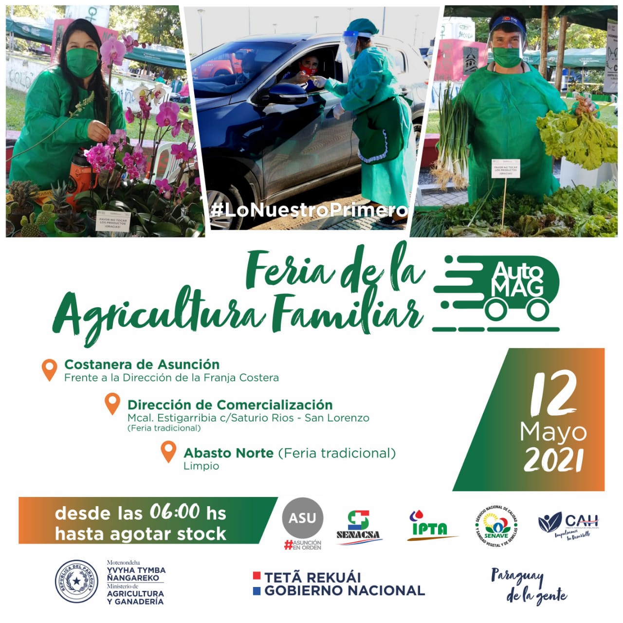 El jueves 12 de mayo del corriente, Productores organizados y asistidos por el Ministerio de Agricultura y Ganadería, desde las 06:00 hs. hasta agotar stock estarán ofertando productos frescos, en las ferias agropecuarias de Productos de la Agricultura Familiar, en forma simultánea, en tres puntos de ventas: