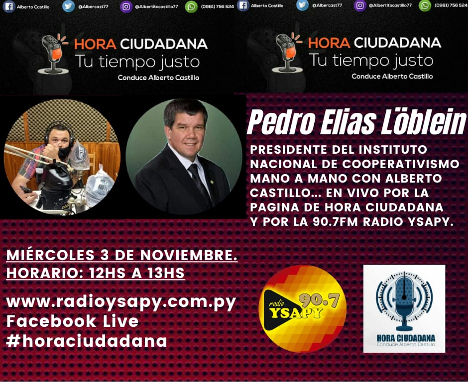 El pasado 3 del corriente el presidente del INCOOP , Lic. Pedro Elías Löblein compartió con el conductor Alberto Castillo en su programa radial «Hora Ciudadana», emitido por la 90.7 Radio YSAPY FM, tocando temas puntuales sobre cooperativismo y afines.
