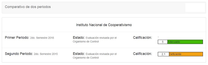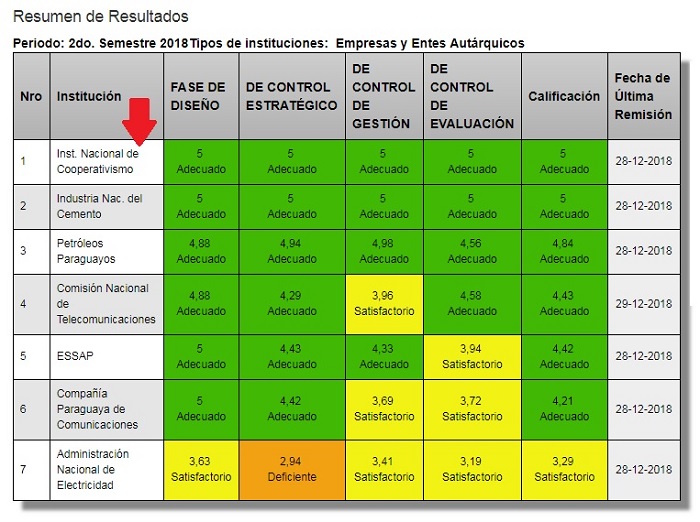 El Instituto Nacional de Cooperativismo fue objeto de evaluación del MECIP por la Auditoria General del Poder Ejecutivo (AGPE), correspondiente al segundo semestre del 2018, ha arrojado la calificación máxima de 5 (cinco), cuya interpretación es Adecuado, quedando en primer lugar entre las Entidades Autonomas y Autarquicas, bajo la supervisión de la Autoridad de Control Externo de los entes Públicos.
