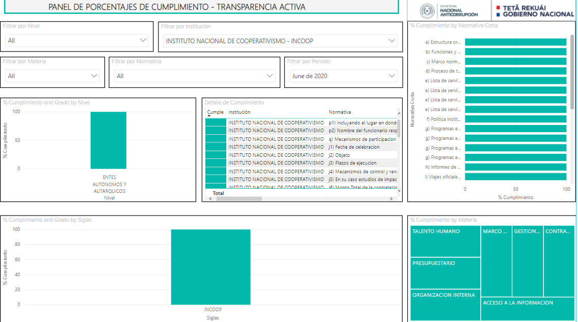 El Instituto Nacional de Cooperativismo – INCOOP cumple con el 100% en Transparencia Activa, con los datos evaluados al mes de junio de 2020.